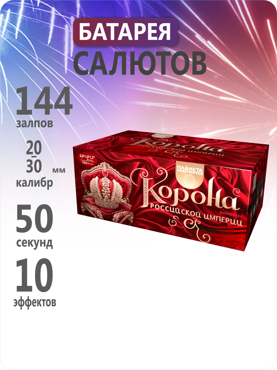 Веерный фейерверк «Корона Российской Империи»: грандиозное пиротехническое шоу в духе великих эпох!Представляем впечатляющее зрелище, достойное самых торжественных событий. 144 мощных заряда калибра от 0,8 до 1,2 дюйма создают феерию света и цвета на высоте до 40 метров. Длительность шоу 50 секунд незабываемых впечатлений.Идеальный выбор для Нового года, свадьбы, юбилея или любого события, которое хочется сделать по-настоящему величественным. Пусть ваш праздник войдёт в историю!