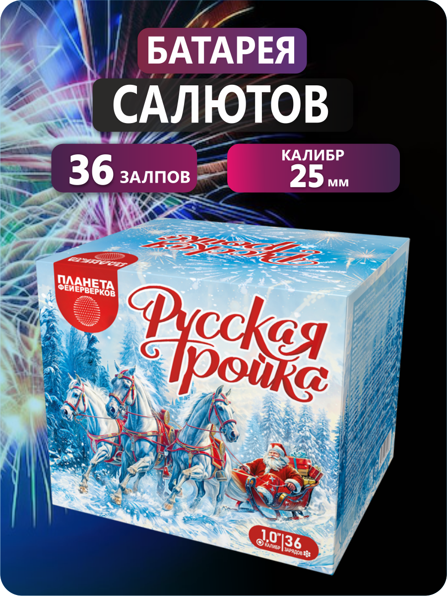 «Русская тройка» — огненная упряжка, несущаяся по ночному небу, чтобы подарить вам мгновения настоящего волшебства!36 зарядов калибром 1 дюйм взмывают на высоту до 25 метров, чтобы за 50 секунд создать над вами картину, полную бесстрашия и красоты. Словно кони, несущие праздник в каждый дом, залпы фейерверка рассыпают по небу россыпь огненных чудес. Пусть ваш праздник озарится сиянием «Русской тройки» — фейерверка, вобравшего в себя дух русской удали и праздничного веселья! «Русская тройка» — фейерверк с характером!