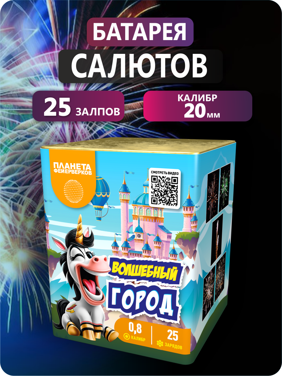 Салют красочный, 25 залпов , калибр 0,8" ;высота разрыва до 20м.