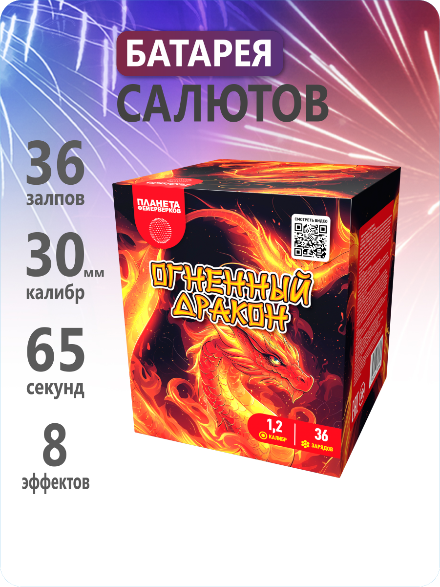 Салют красочный, 36 залпов, калибр 1,2"; высота разрыва до 30м.