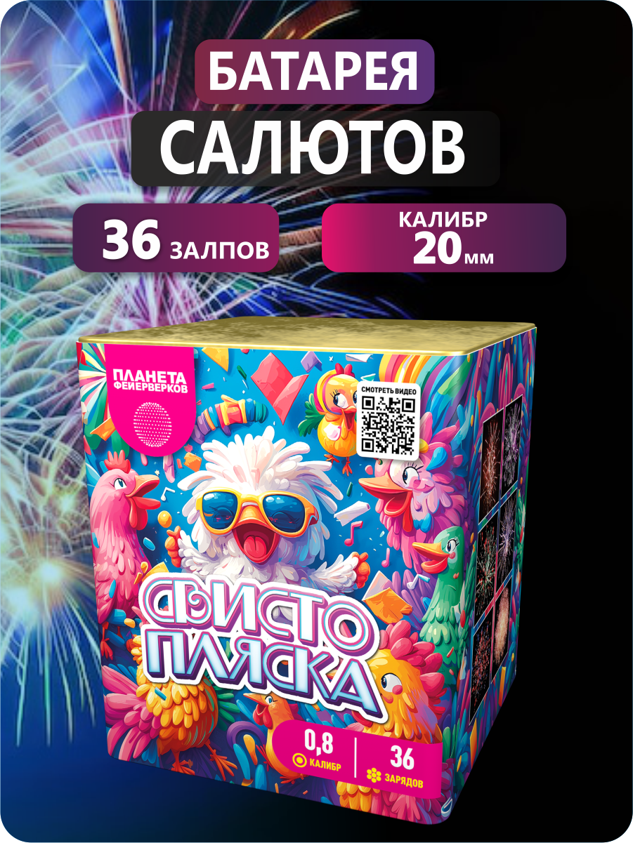 «Свистопляска» — огненный танец, оживающий в ночном небе, чтобы подарить вам мгновения настоящего волшебства! 36 залпов калибра 0,8 дюйма взмывают на высоту до 20 метров, чтобы создать над вами картину, полную динамики и красок. Словно озорные артисты на празднике, залпы фейерверка сменяют друг друга, даря зрителям череду незабываемых образов. Пусть ваш праздник озарится сиянием «Свистопляски» — фейерверка, полного задора, ритма и праздничного настроения!